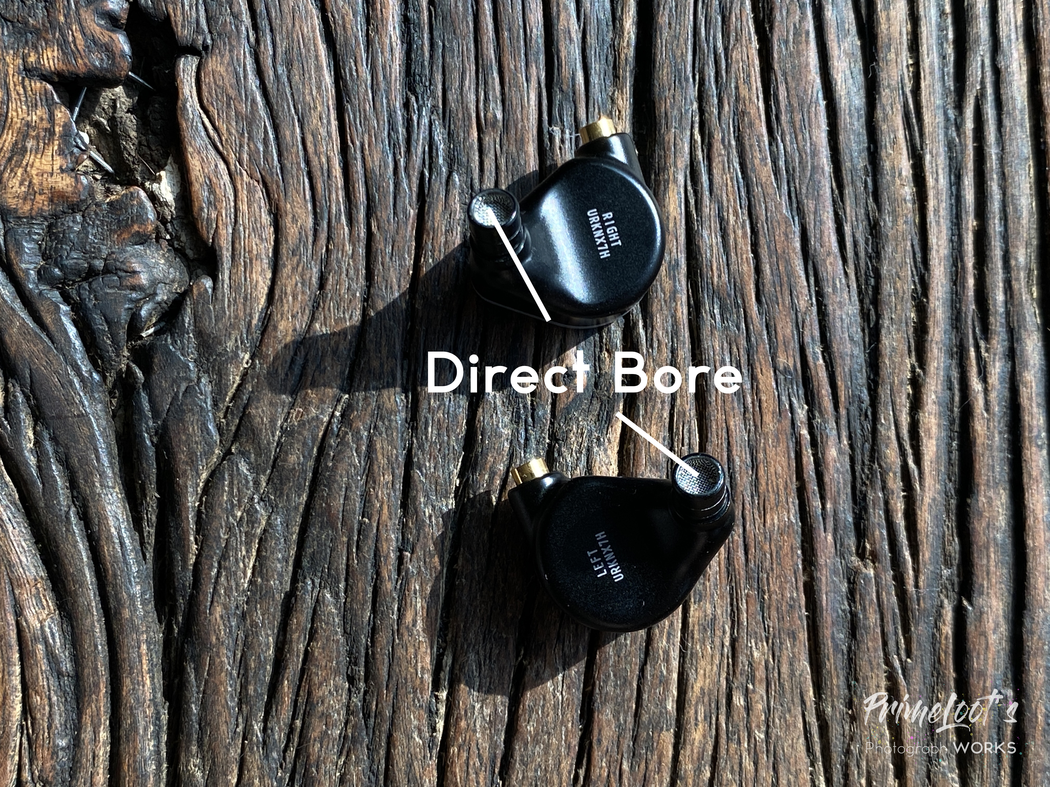 Direct Bore 기술을 통해 직진성이 강한 초고음과 고음 드라이버를 노즐부에 배치하고, 나머지 듀서들은 바로 뒤에 배치하여 여러 노즐부를 타고 한곳으로 모여 귀로 전달되는 양상이 아닌 그저 한 공간에서 같은 공기를 타고 모든 소리가 귀로 들어가는 모습의 설계입니다.