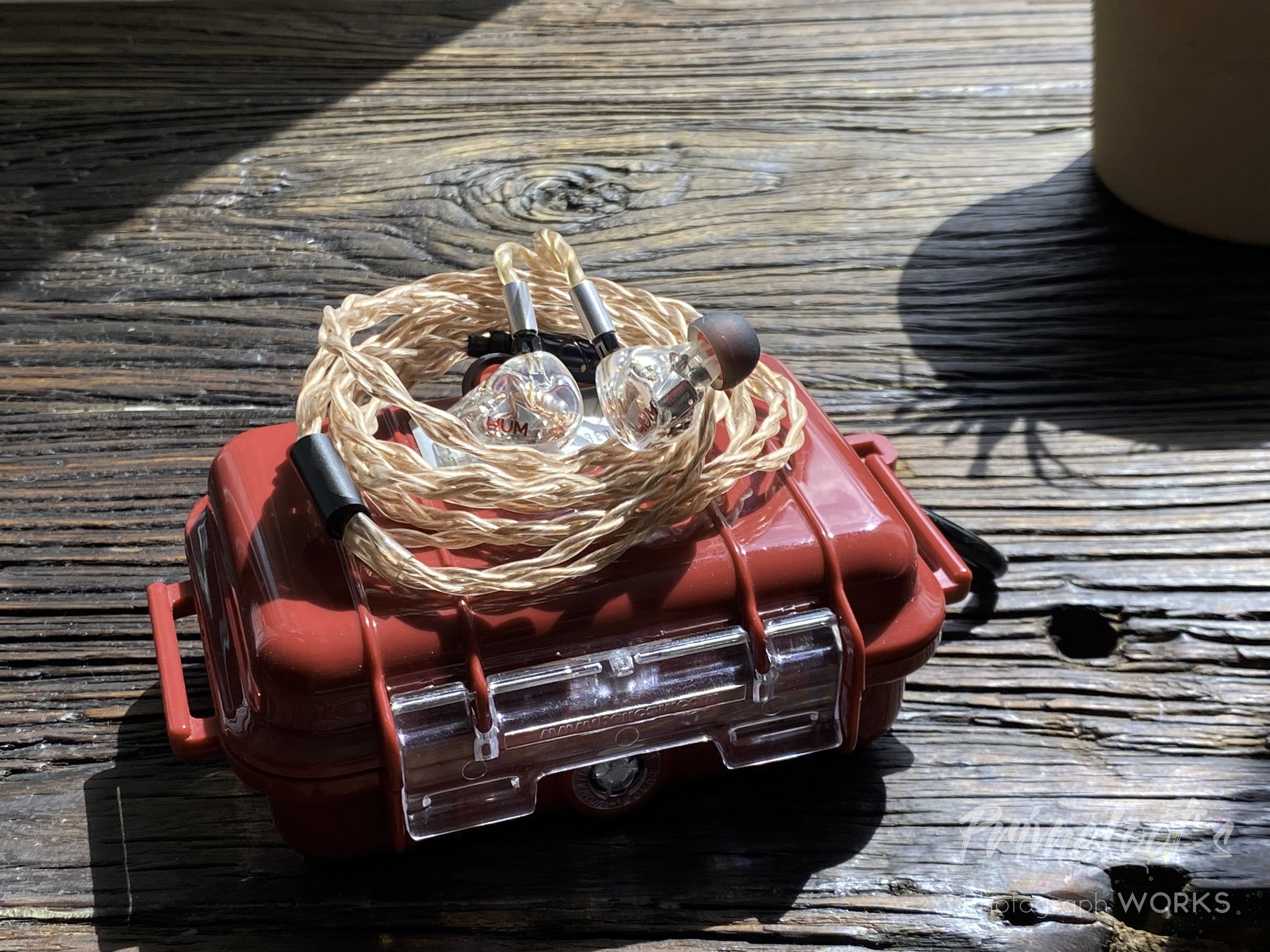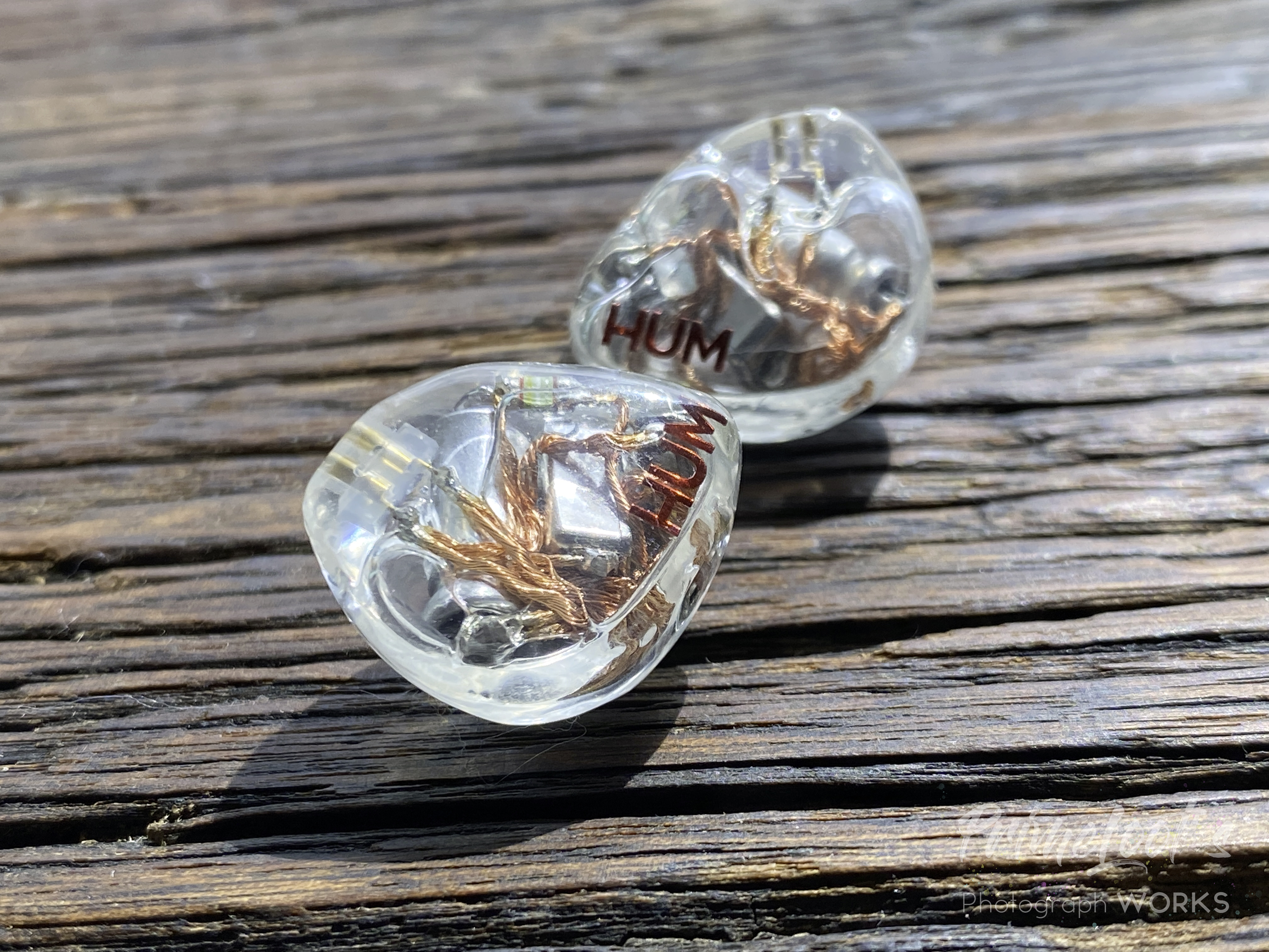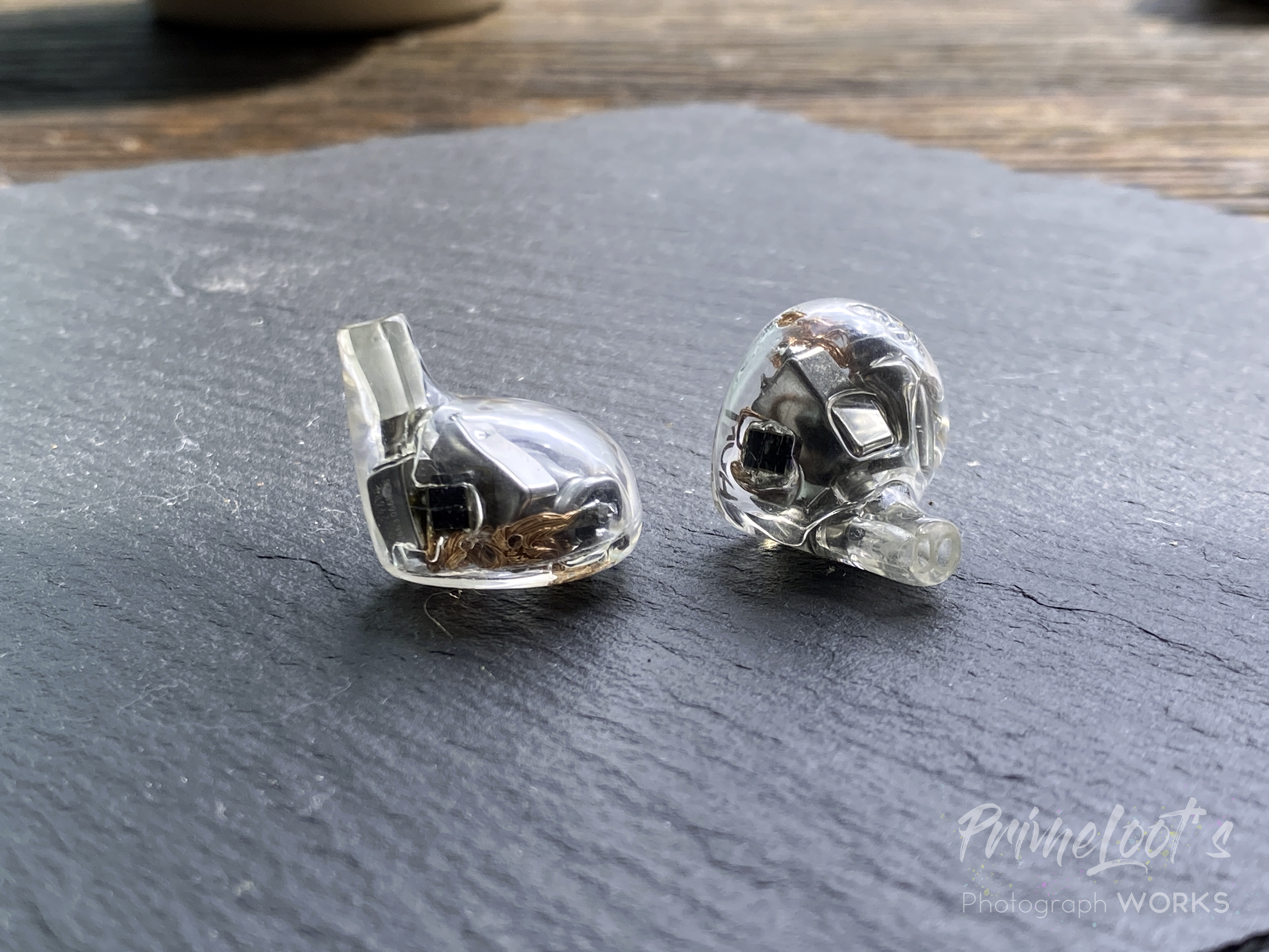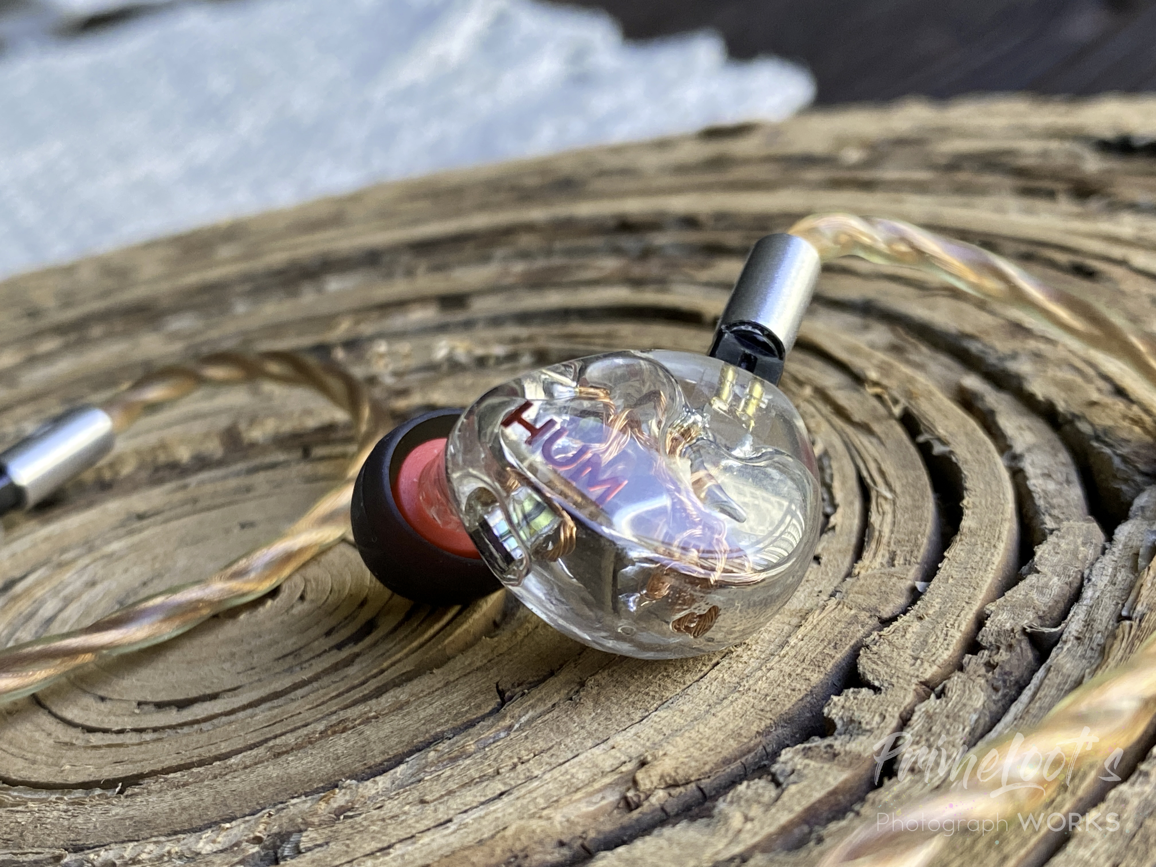 외관부터 내 안에는 무려 이런게 있다를 뽐내고 있습니다. 완전히 투명한 쉘 내부로는 2개의 BA와 거대한 커패시터가 그대로 보이며 저항도 숨어있는 모습입니다. 쉘에는 빨간색 HUM로고만 간단히 배치하여 포인트를 주었습니다. 대부분의 레진 유니버설 이어폰은 노즐부에 팁들을 고정하기 위해 모양을 성형하거나 메탈소재의 연결부를 접합하는 경우가 대부분인데 그것조차 없이 커스텀으로 맞춘듯이 쭉 이어진 직선형 노즐을 채택하고있습니다. 더욱 놀라운 점은 필터조차 없이 귀 내부로 그대로 이어집니다. 유닛에서 발생하는 사운드를 그대로 귀에 직사하는 모양새입니다.