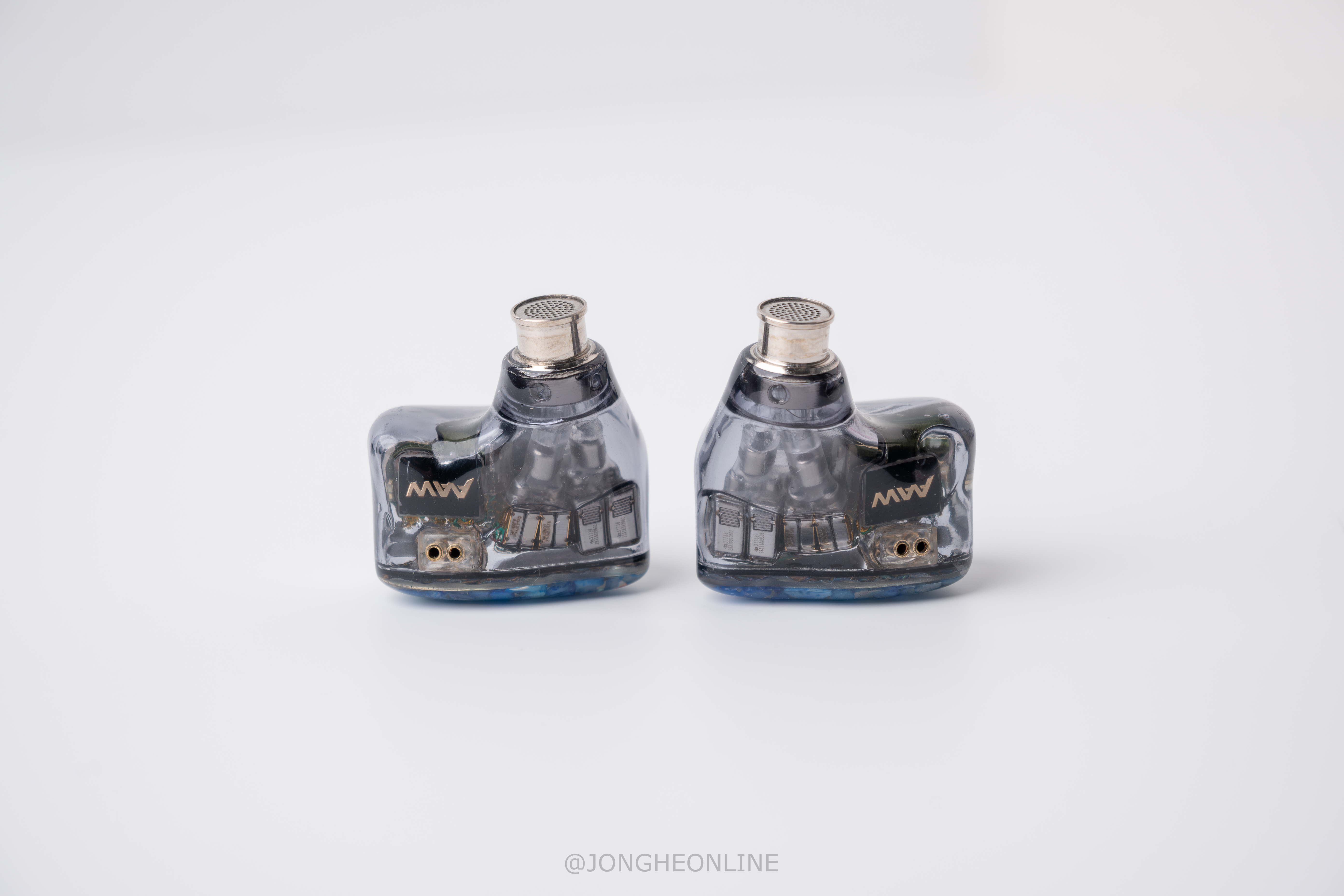 속이 잘 보이는 김에 이야기를 해보자면 카나리 프로는 2개의 Isobaric 드라이버, 8개의 BA, 4개의 EST 드라이버로 구성되어 5-Way Crossover 형태로 설계되어 있습니다. 전작인 카나리에 비해 드라이버가 한 쪽당 6개씩 늘어났는데 이는 사운드의 더 정밀한 분할과 제어가 가능해졌음을 의미합니다.